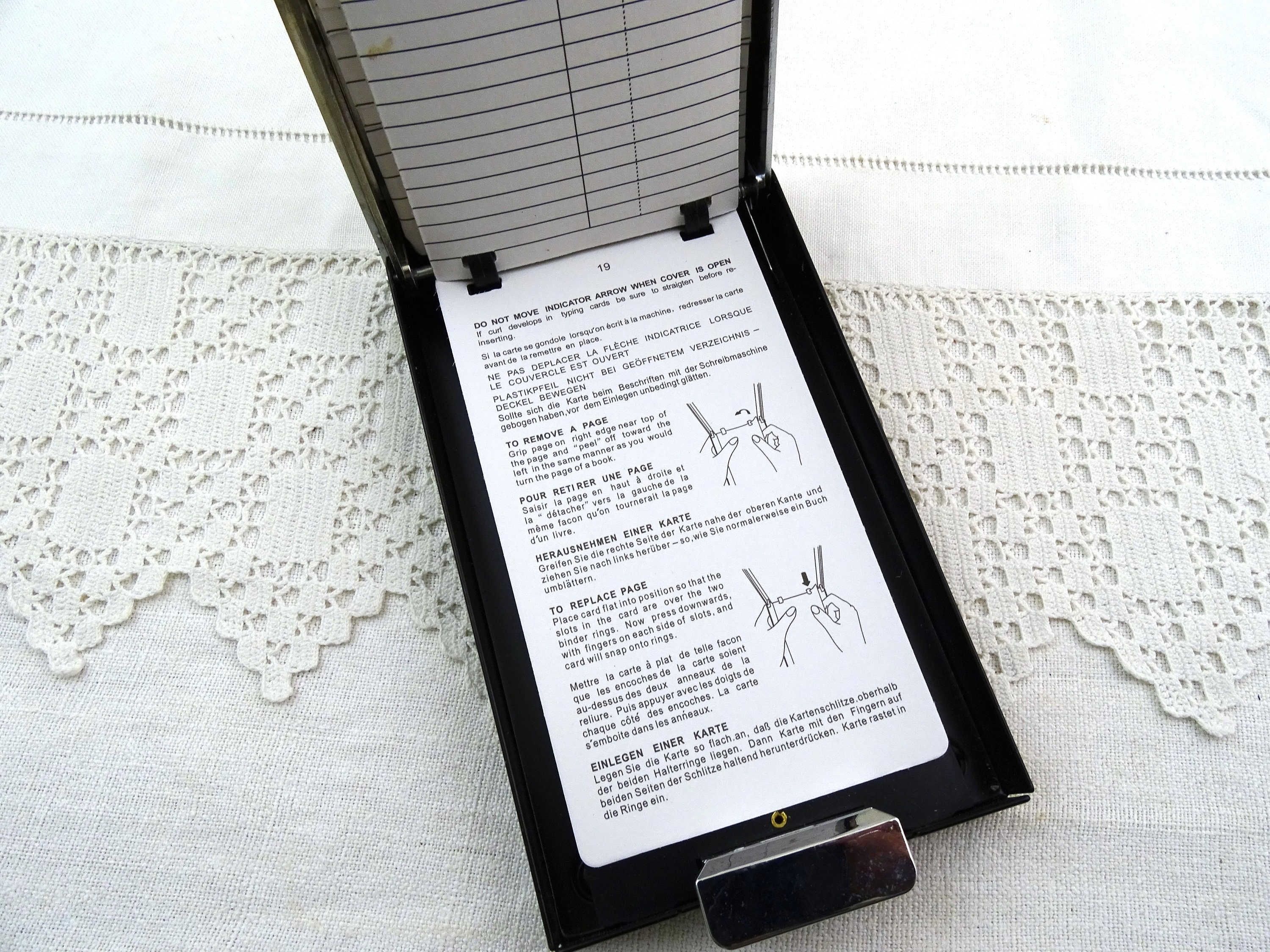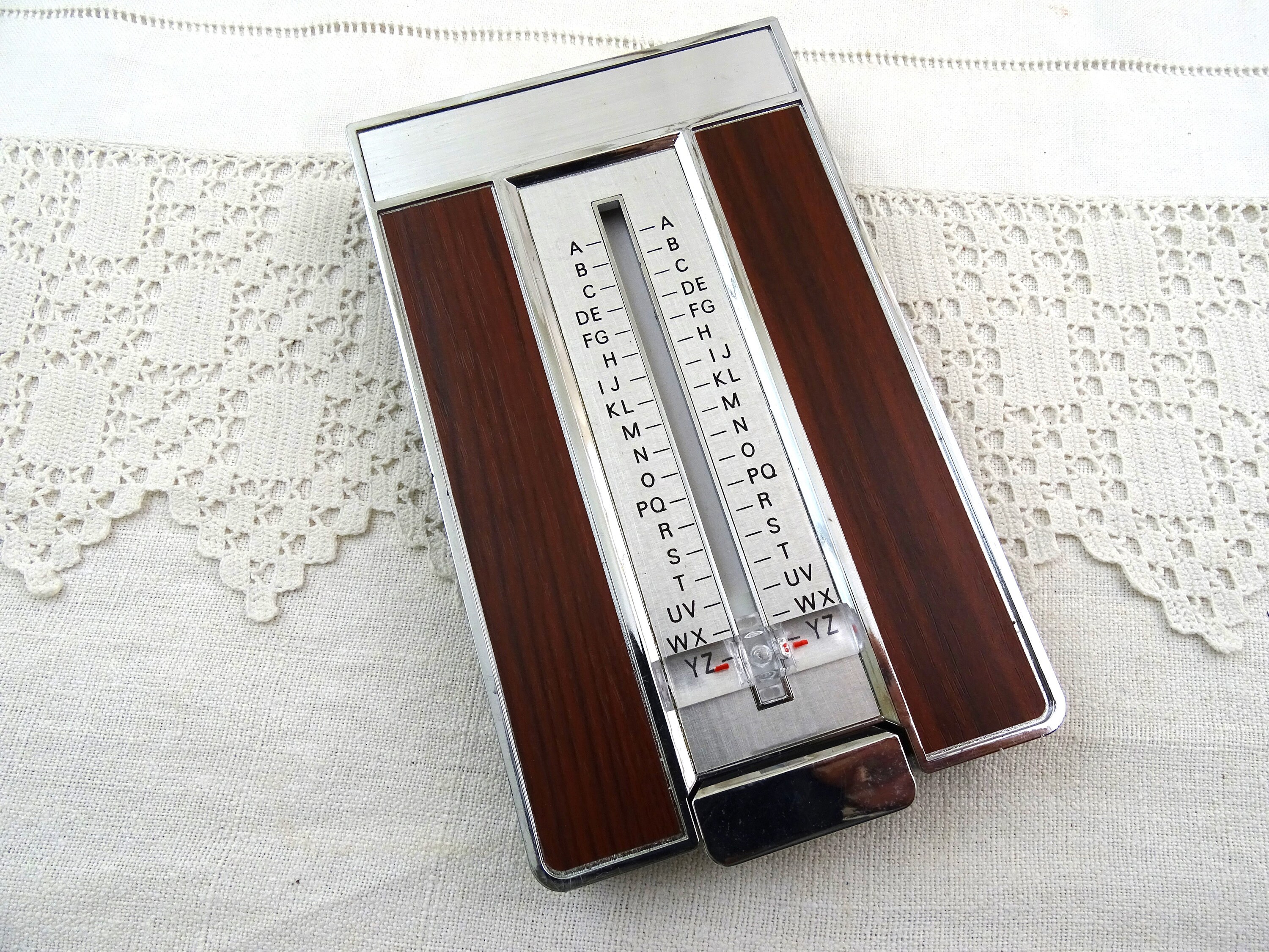 Vintage unused pop up phone number and address file. Made of thick silver colored plastic with fake wooden veneer the base is made of black colored metal. All the cards are unused. Circa 1960s / 1970s.