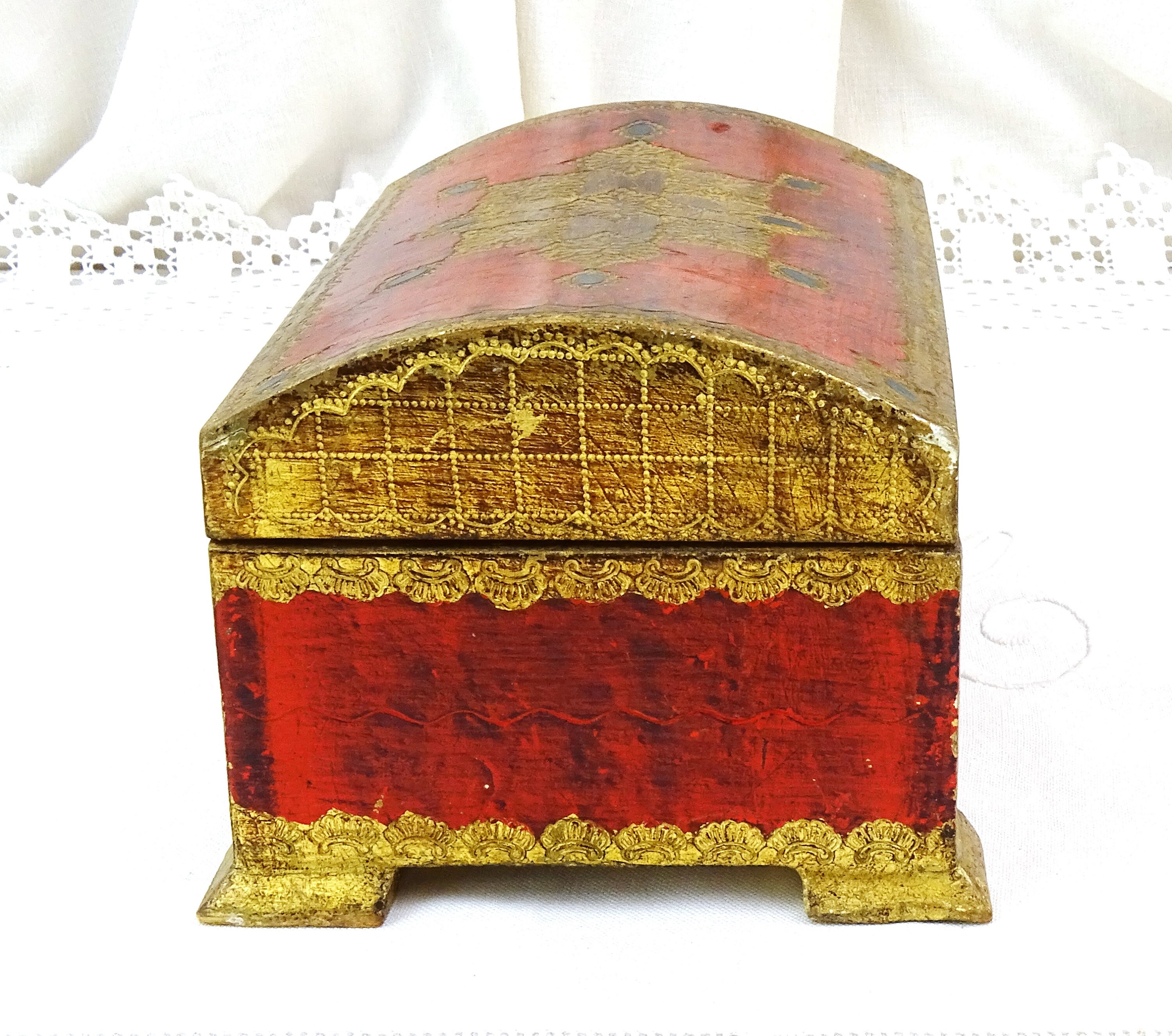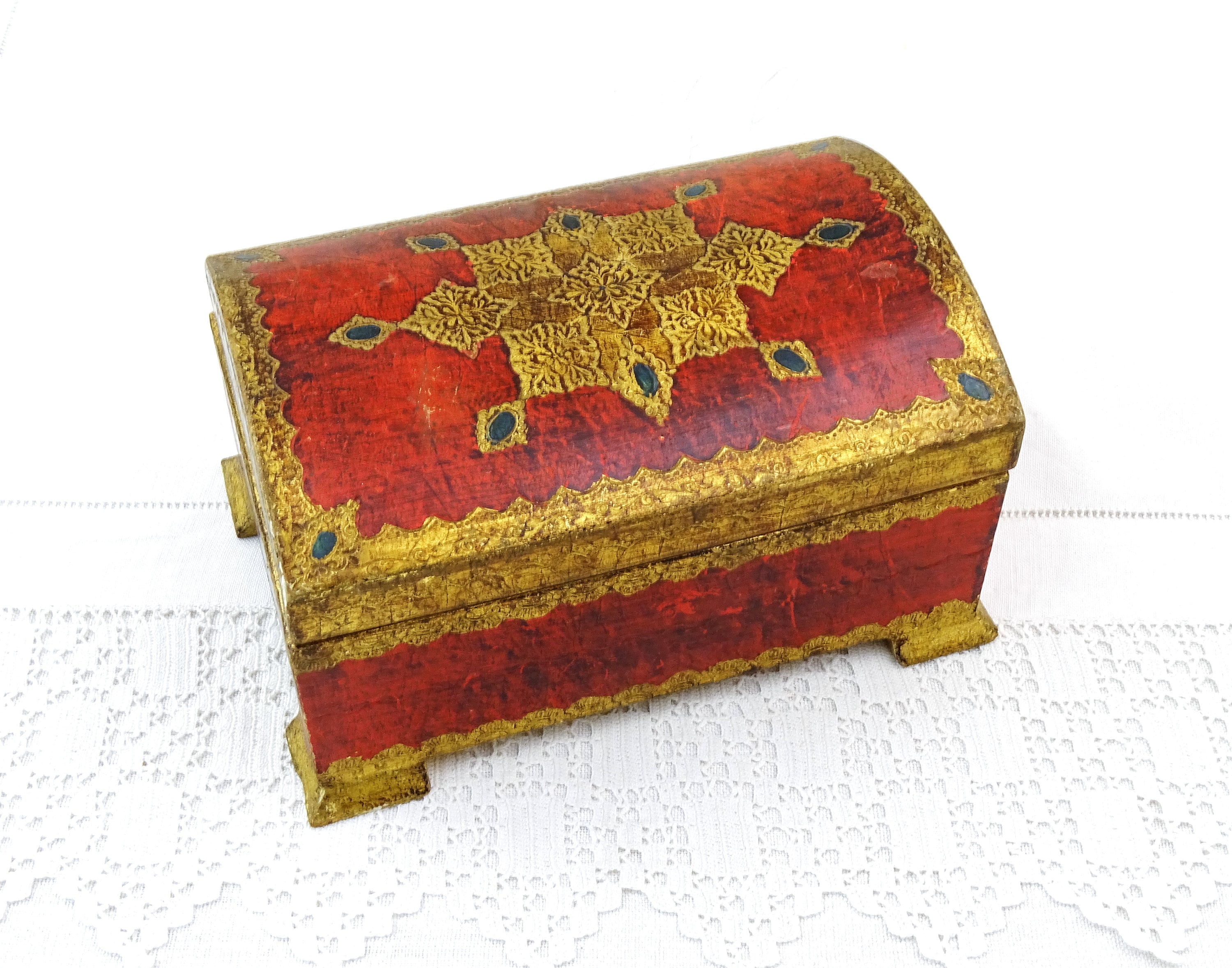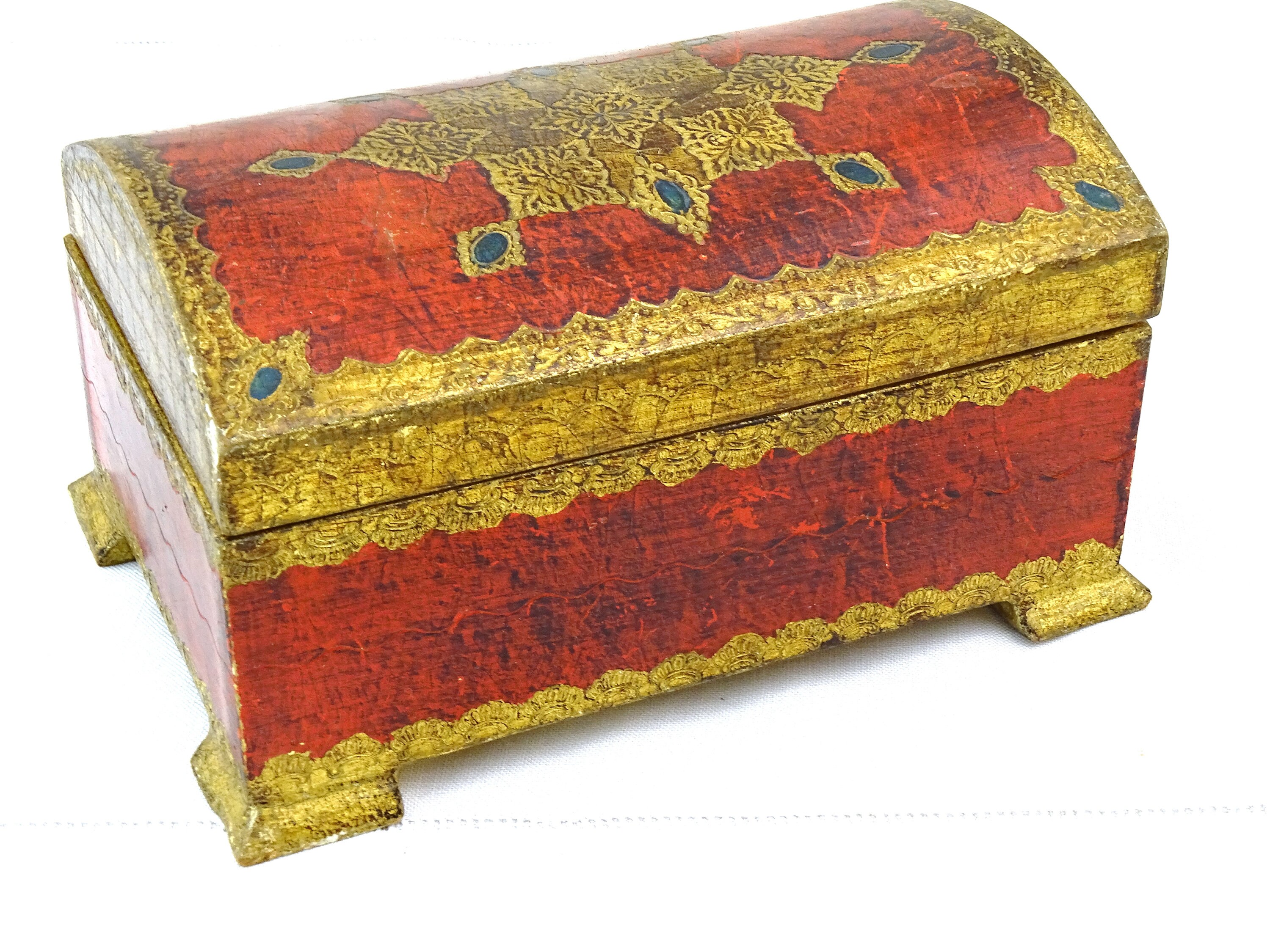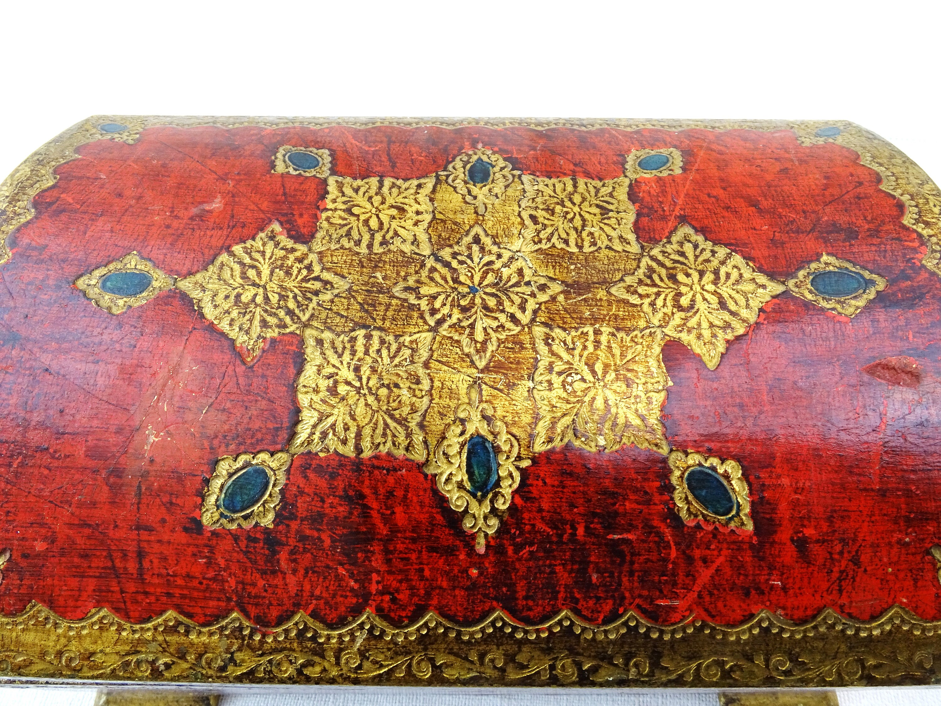 Vintage Venetian jewelry box with rounded lid. Made of wood which is decorated with red and gold pattern. Yellow satin interior. Ca 1960s.