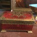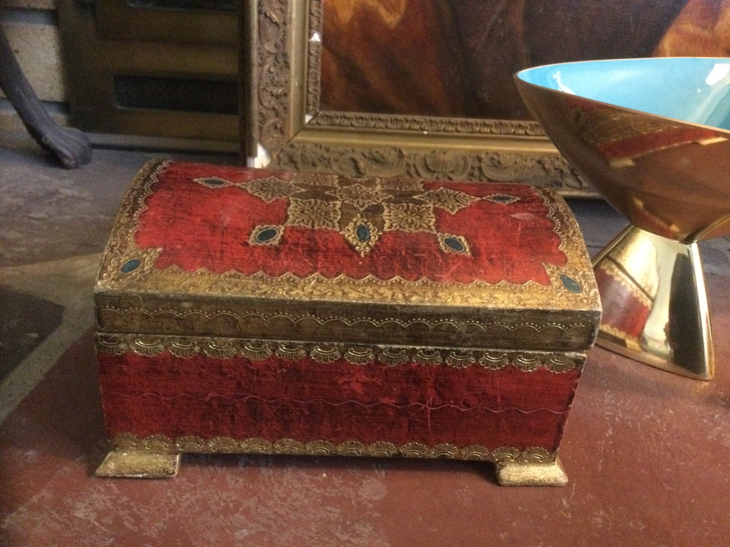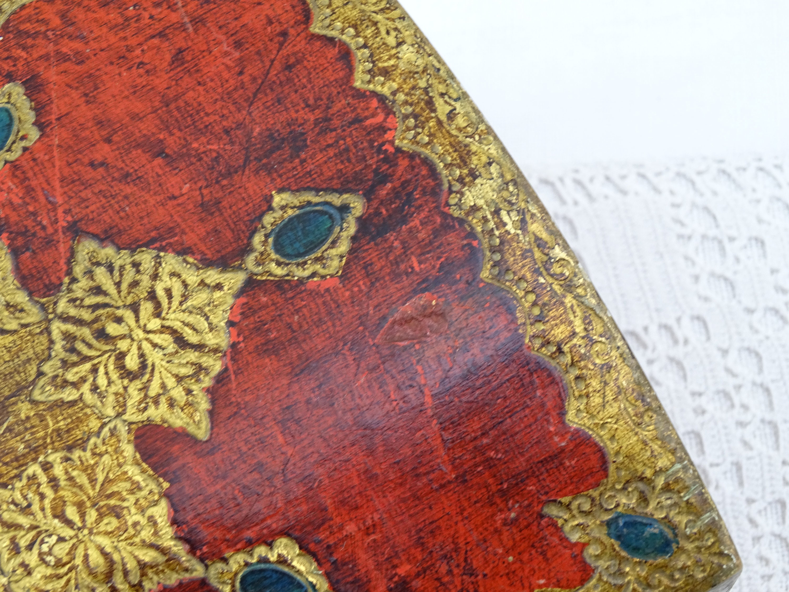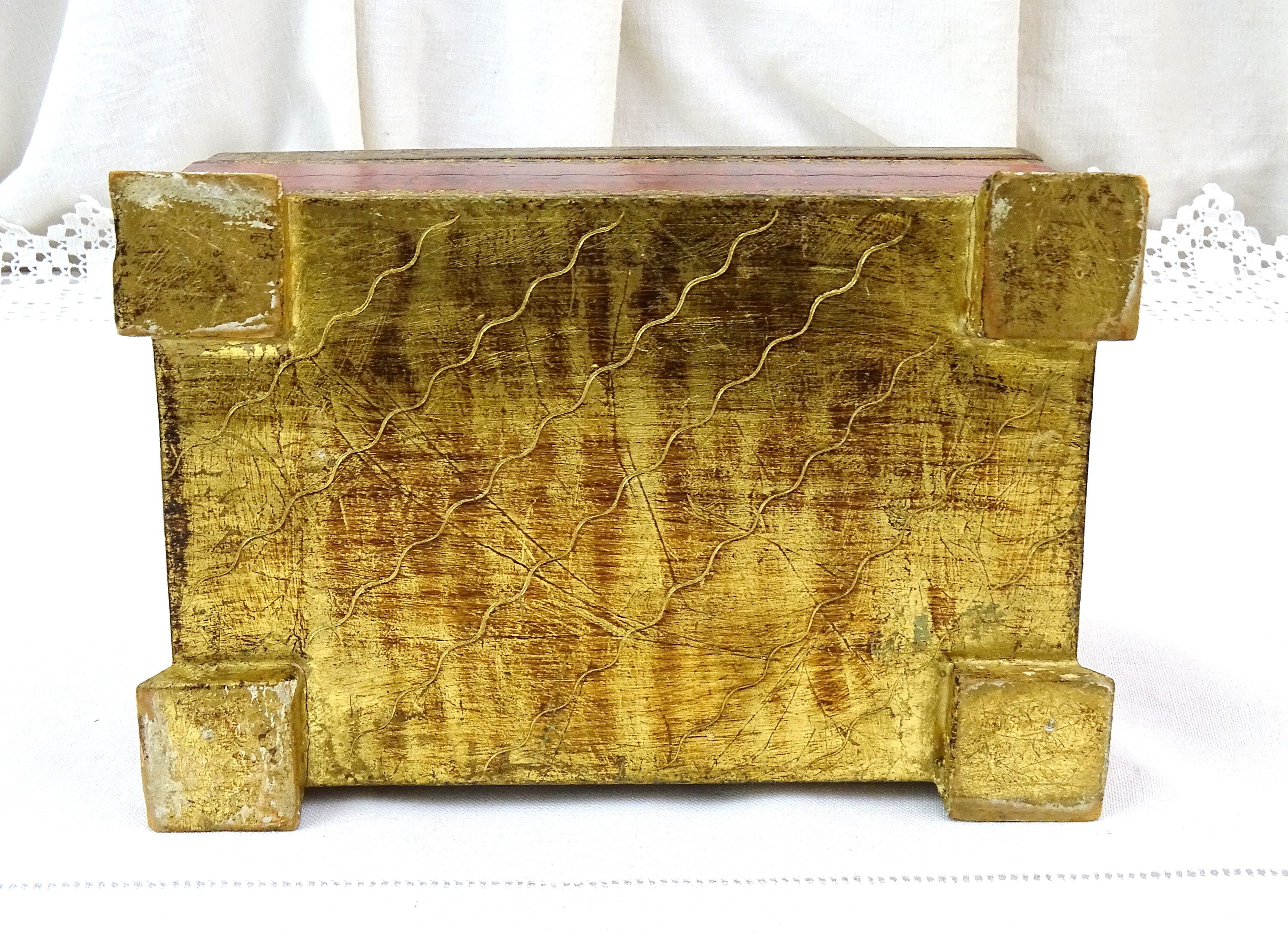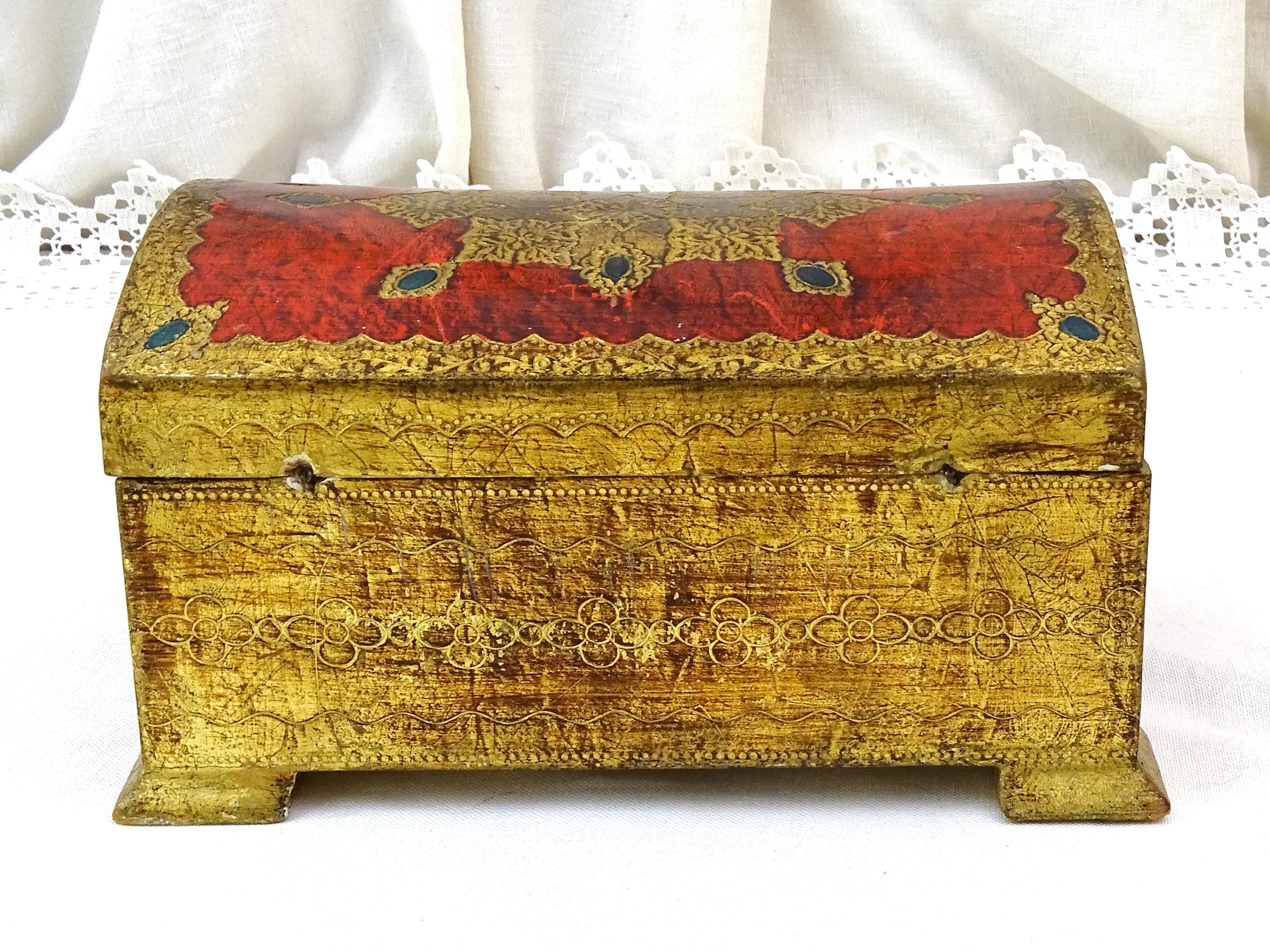 Vintage Venetian jewelry box with rounded lid. Made of wood which is decorated with red and gold pattern. Yellow satin interior. Ca 1960s.
