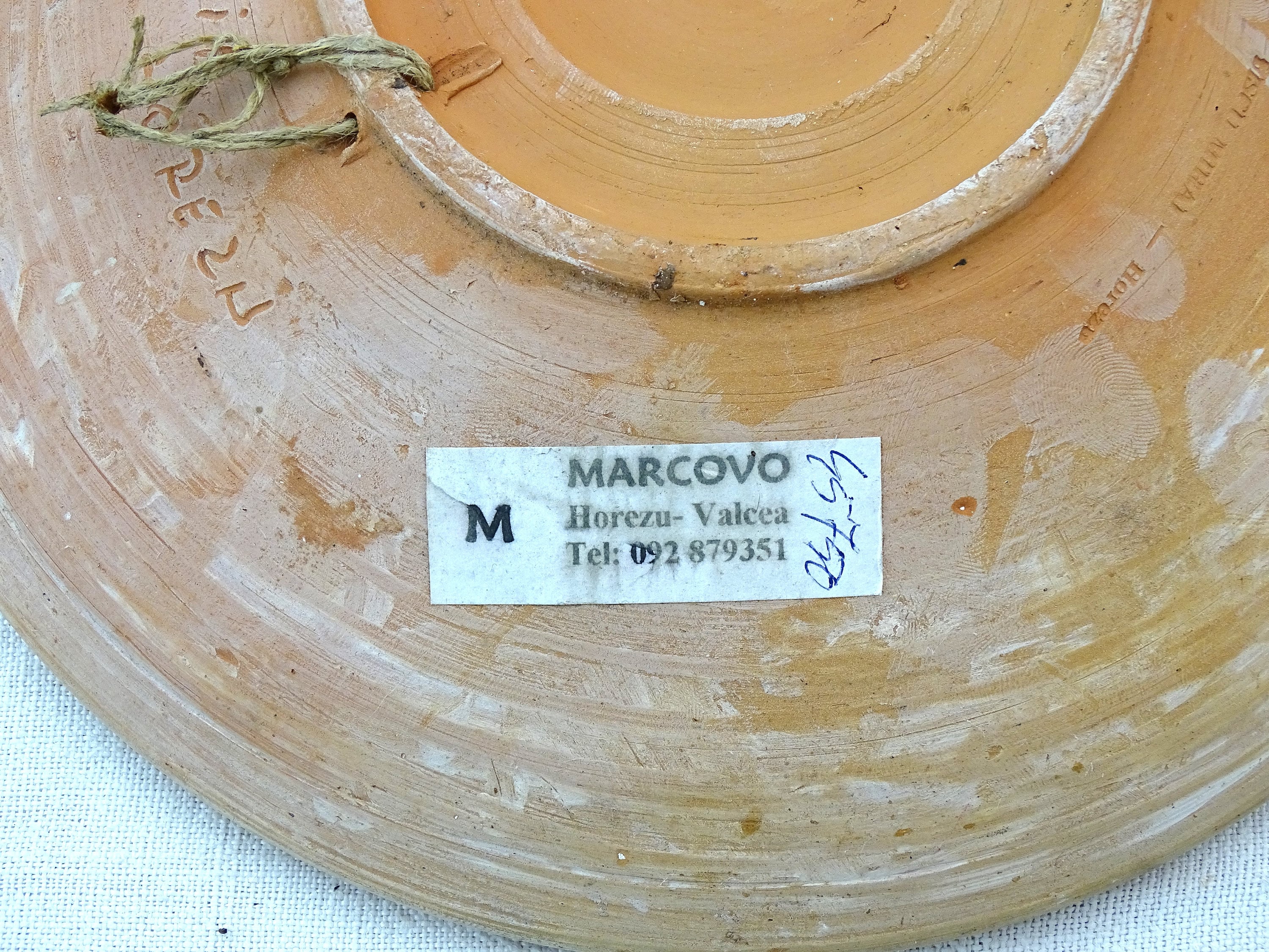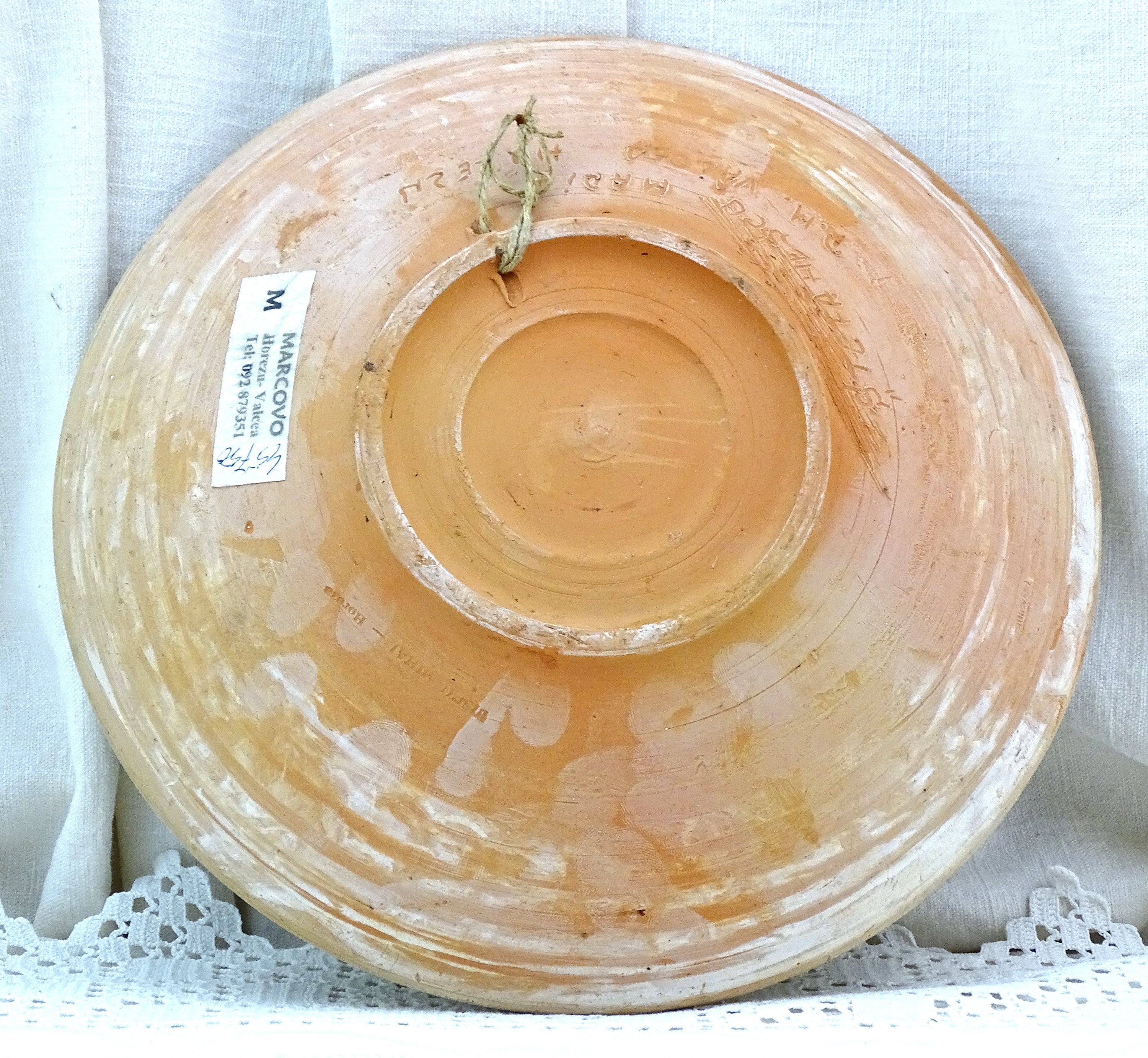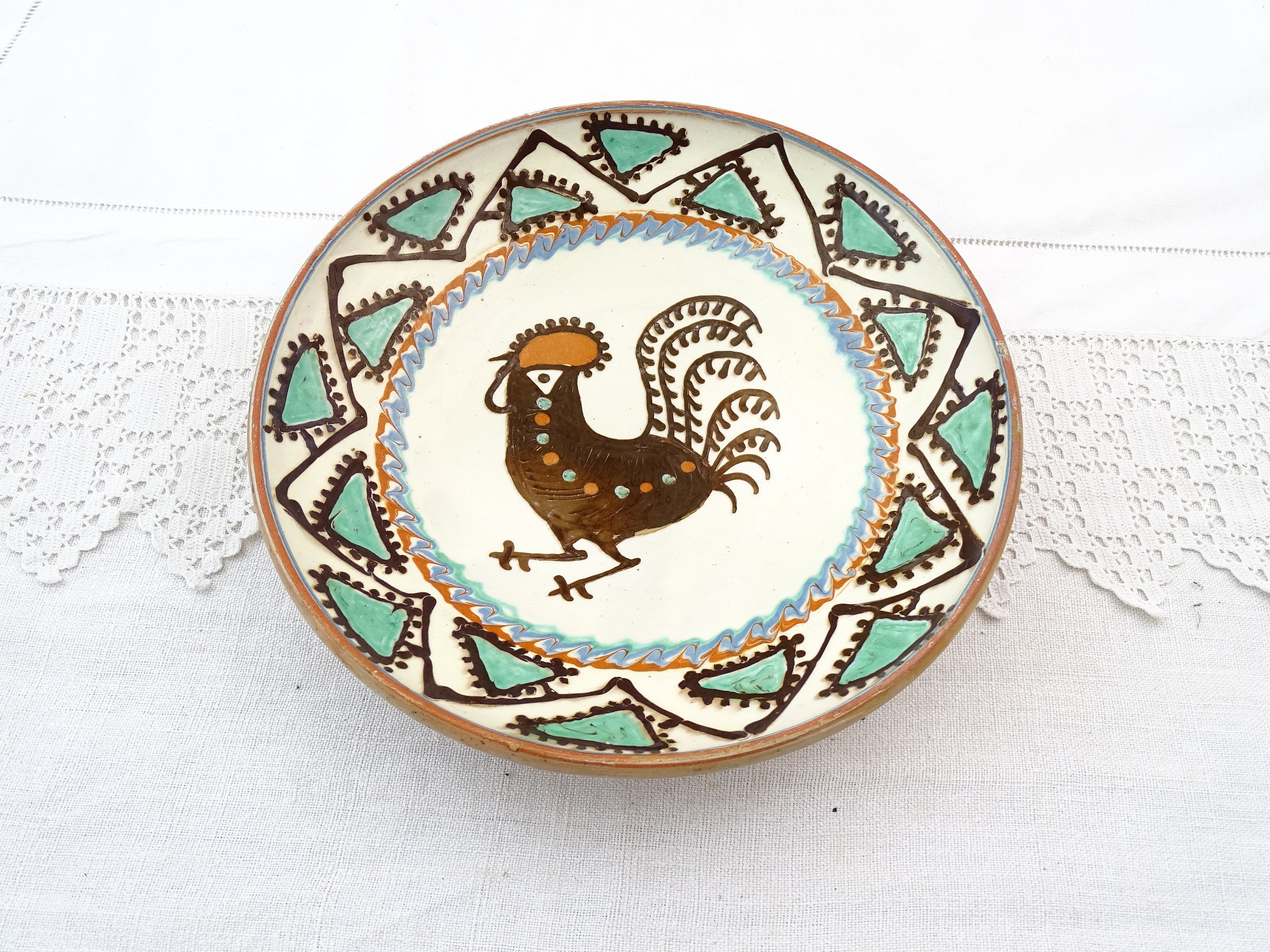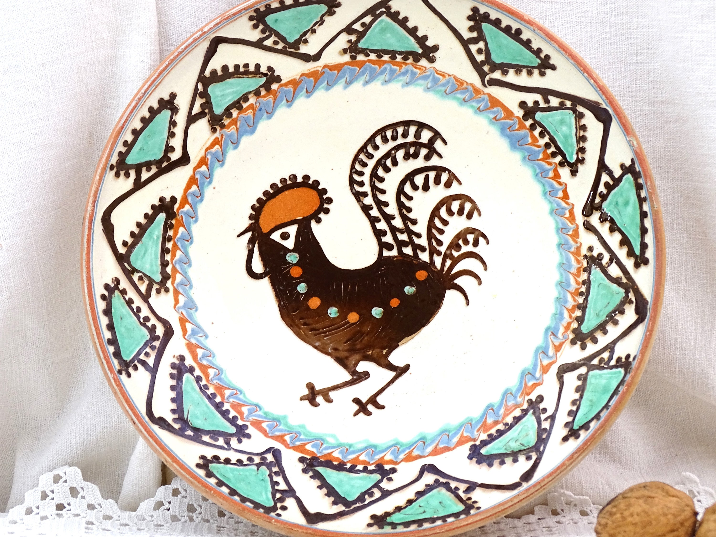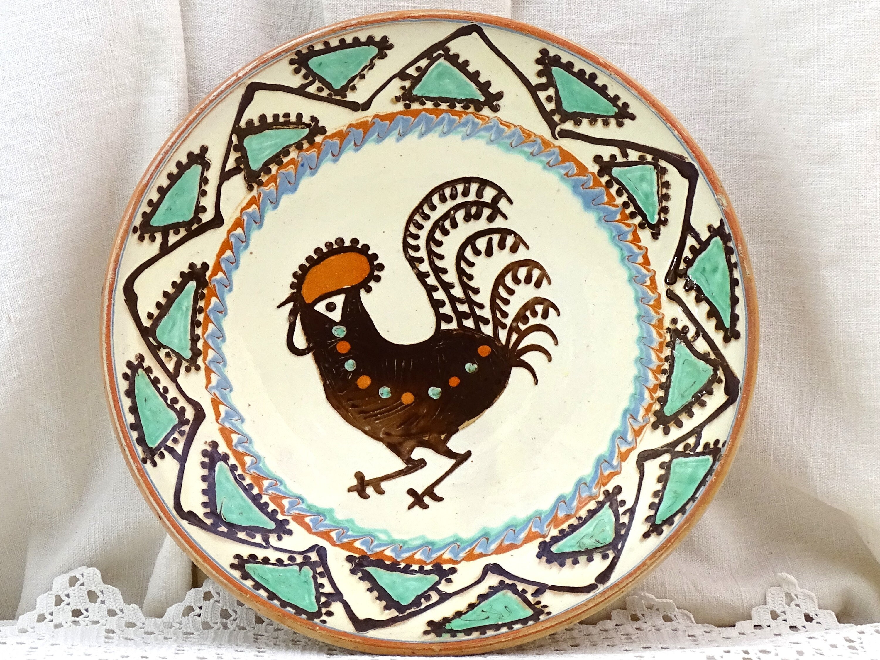 Vintage Romanian slipware wall plate / dish with a rooster pattern. Made by Marcovoin Horezu Valcea Romania of glazed earthenware pottery. Hanging loop at the rear. Ca 1960s.