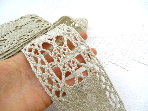 Wide French Vintage Beige Linen Lace Trim 2 Meters 20 cm / 7 Feet 21 inches, Lacy Ribbon from France, Farmhouse Sewing Craft Accessory